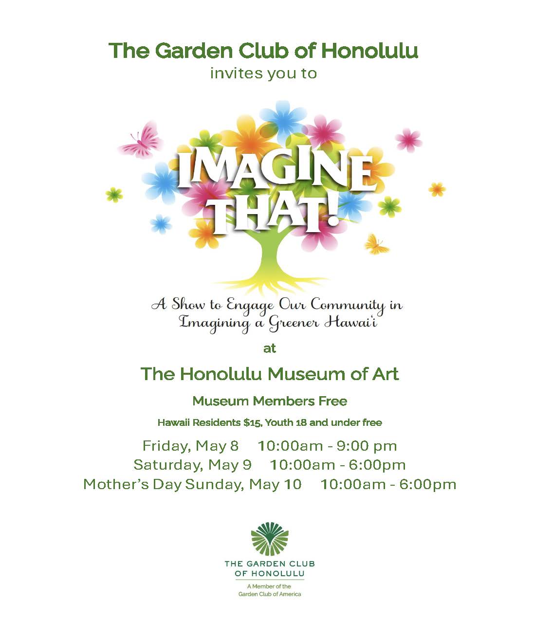 The Garden Club of Honolulu (TGCH) invites the public to ImagineThat!, a Garden Club of America Major Flower Show, on May 8–10, 2026, at theHonolulu Museum of Art.Since 1931, TGCH shows have showcased excellence in horticulture, floral andbotanical design, photography, and conservation. This tradition continues with ImagineThat!, a show designed to spark creativity and inspire thoughtful action toward a moreresilient Hawai‘i.The theme encourages the community to see nature’s gifts in new ways—creatingbeauty, addressing environmental challenges, and envisioning a greener, stronger, andsafer future for our islands.Timed for Mother’s Day weekend, the show offers a unique way to celebrate with lovedones while experiencing extraordinary floral artistry and innovative garden displays.