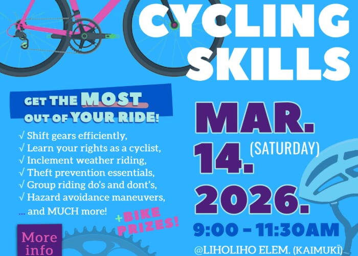 "LEVEL UP YOUR PEDALING PROWESS & GET THE MOST OUT OF YOUR BIKE & GEAR.》》》REGISTRATION REQUIRED: https://secure.hbl.org/nx/portal/neonevents/events?path=%2Fportal%2Fevents%2F36137 This 2.5-hr workshop equips any adult rider with the knowledge, skills, and “insider cycling scoops” to tackle any road situation! Want to get better at tackling hills? You’ll learn efficient shifting & braking techniques here! New to group riding? Our expert League Cycling Instructors will cover the essential do’s and dont’s for safe group riding \(and will help you look like a seasoned cyclist at your first group ride!\). You’ll get to master bike control by performing advanced avoidance maneuvers to keep the “rubber side down” before wrapping up with an instructor-led group ride around the neighborhood.𝘛𝘩𝘪𝘴 𝘸𝘰𝘳𝘬𝘴𝘩𝘰𝘱 𝘪𝘯𝘤𝘭𝘶𝘥𝘦𝘴:☛ Your rights & responsibilities for riding on the road in Hawai‘i.☛ Gear & equipment: The essentials, night-riding, and tips on riding in inclement weather.☛ Effective shifting techniques.☛ Group riding etiquette: do’s and dont’s.☛ Types of hazards & how to avoid crashes.☛ Advanced on-bike hazard avoidance maneuvers.☛ Instructor-led group ride around the neighborhood to take our skills to the streets.【 More info at: HBL.org/workshops 】