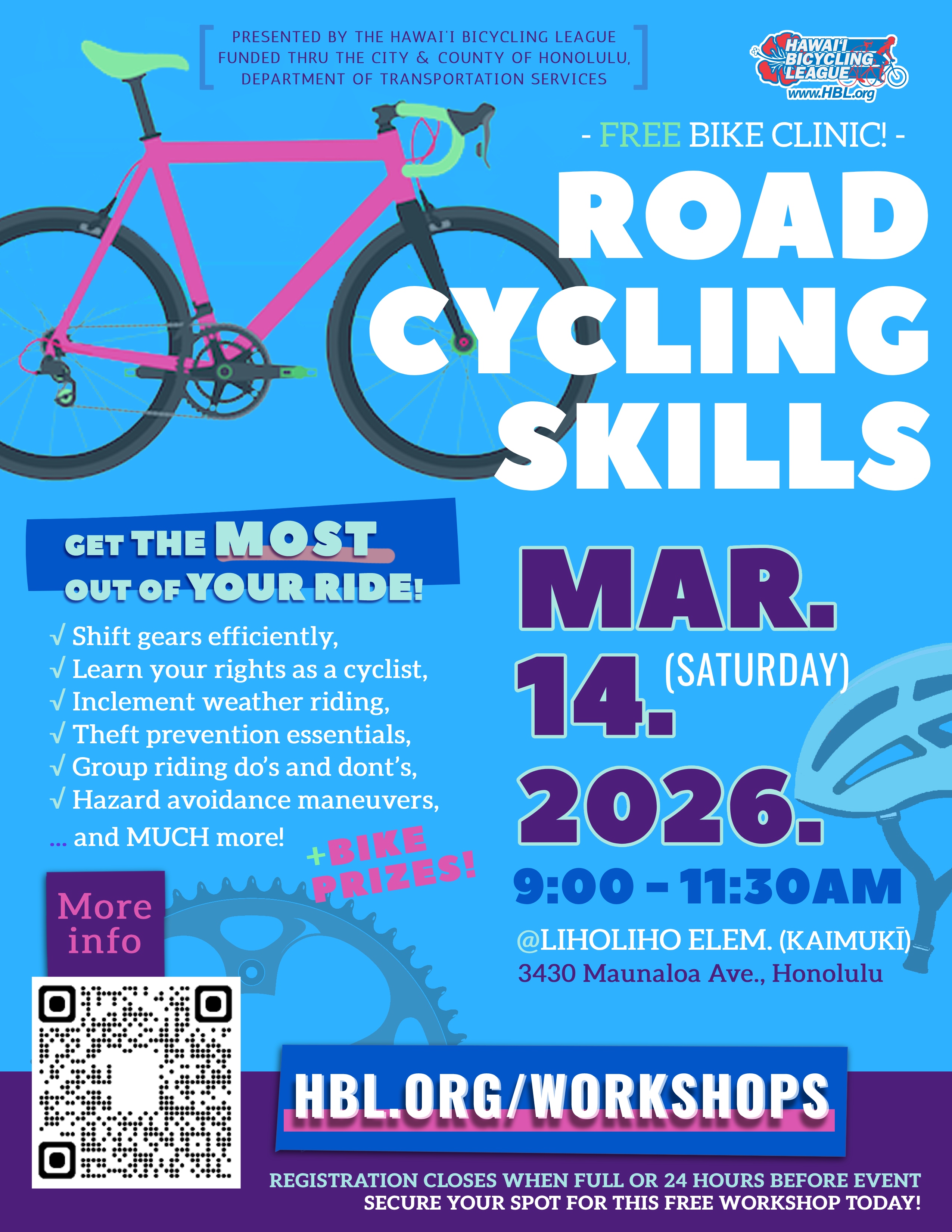 """LEVEL UP YOUR PEDALING PROWESS & GET THE MOST OUT OF YOUR BIKE & GEAR.》》》REGISTRATION REQUIRED: https://secure.hbl.org/nx/portal/neonevents/events?path=%2Fportal%2Fevents%2F36137 This 2.5-hr workshop equips any adult rider with the knowledge, skills, and “insider cycling scoops” to tackle any road situation! Want to get better at tackling hills? You’ll learn efficient shifting & braking techniques here! New to group riding? Our expert League Cycling Instructors will cover the essential do’s and dont’s for safe group riding (and will help you look like a seasoned cyclist at your first group ride!). You’ll get to master bike control by performing advanced avoidance maneuvers to keep the “rubber side down” before wrapping up with an instructor-led group ride around the neighborhood.𝘛𝘩𝘪𝘴 𝘸𝘰𝘳𝘬𝘴𝘩𝘰𝘱 𝘪𝘯𝘤𝘭𝘶𝘥𝘦𝘴:☛ Your rights & responsibilities for riding on the road in Hawai‘i.☛ Gear & equipment: The essentials, night-riding, and tips on riding in inclement weather.☛ Effective shifting techniques.☛ Group riding etiquette: do’s and dont’s.☛ Types of hazards & how to avoid crashes.☛ Advanced on-bike hazard avoidance maneuvers.☛ Instructor-led group ride around the neighborhood to take our skills to the streets. 【 More info at: HBL.org/workshops 】"