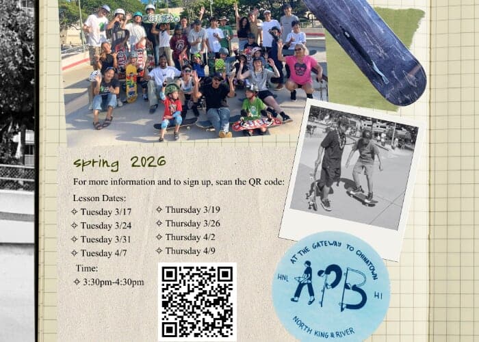 Join APB Stakeboard at ʻAʻala Park for free keiki skateboard lessons sponsored by American Savings Bank and Trust for Public Land! Lessons will be held Tuesdays and Thursdays from March 17 through April 9, 2026, from 3:30–4:30 p.m. Youth in grades K-12 and all skill levels are welcome! Scan the QR code on the flyer to register and get more information.