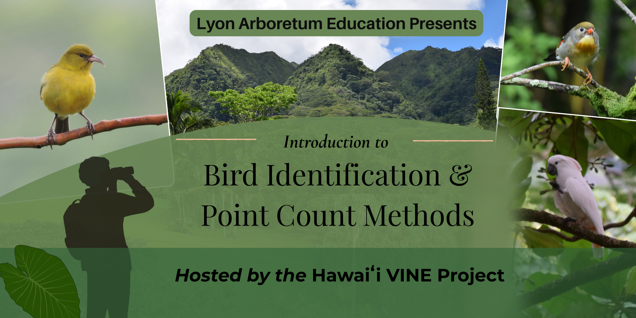 Join the Hawaii VINE project for a bird identification workshop for the first time on O‘ahu’s birds and conservation efforts!The Hawaii VINE project is a long-term research study focused on seed dispersal networks across O‘ahu. As part of our work, we conduct point counts to identify and quantify the number of birds found in certain parts of the island. Participants will learn to identify birds by sight and sound and to conduct point counts, which are essential to many bird conservation efforts.Instructors: The VINE crew is a group of biologists who double as bird enthusiasts! We are from various states and range in years of experience, but we have all dedicated our careers to field work to conserve wildlife. Part of our passion is to share and educate about birds and conservation, so we are thrilled to offer a hands-on experience. We know how important it is to learn science in real time, and we can't wait to share our work with students!The class will be held indoors and outdoors and participants must be prepared for uneven terrain and outdoor field conditions, including rain and mosquitoes.This class is open to ages 12+. Participants under 18 must be accompanied by a parent or guardian. This structured field workshop is intended for individuals who are genuinely interested in learning bird identification and conservation monitoring skills.