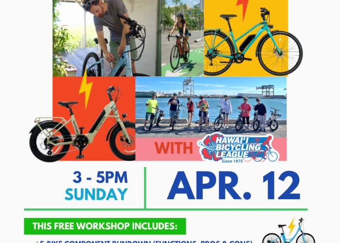 This 2-hour interactive workshop is made free to the public through a grant from the Hawai‘i Department of Transportation and will go over the most essential e-bike topics: what Hawai‘i’s laws say about e-bikes, introduction & rundown of e-bike lingo, what sets them apart from traditional bicycles, pros & cons on different component options, and best practices for safe e-biking in Hawai‘i! These workshops are designed to get responsible teens & adults into the awesome world of electric bicycles safely & confidently with Hawai‘i’s bicycling-experts. All registrants will get a chance to test ride e-bikes in this FREE workshop \(we've got an awesome variety of different types and styles of electric bicycles attendees will be able to choose from!\). This workshop is put on by your friends at Hawai‘i Bicycling League with help from a grant through the Hawai‘i Department of Transportation.Workshop is limited to the first 11 people to sign up - secure your spot \(for free!\) at: https://secure.hbl.org/nx/portal/neonevents/events?path=%2Fportal%2Fevents%2F35149Registration will close 2 days before the event.【 For more info on all bike class offered by HBL, check out HBL.org/workshops or call 808-735-5756 】