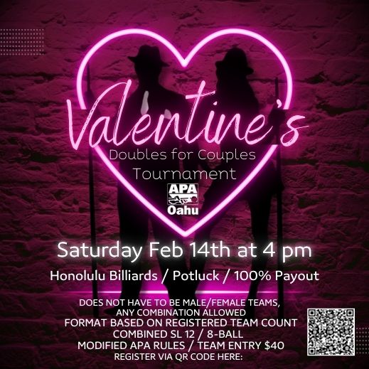 A fun doubles pool tournament for teams of any combination, featuring 8-ball format with modified APA rules, potluck food, and 100% cash payout.