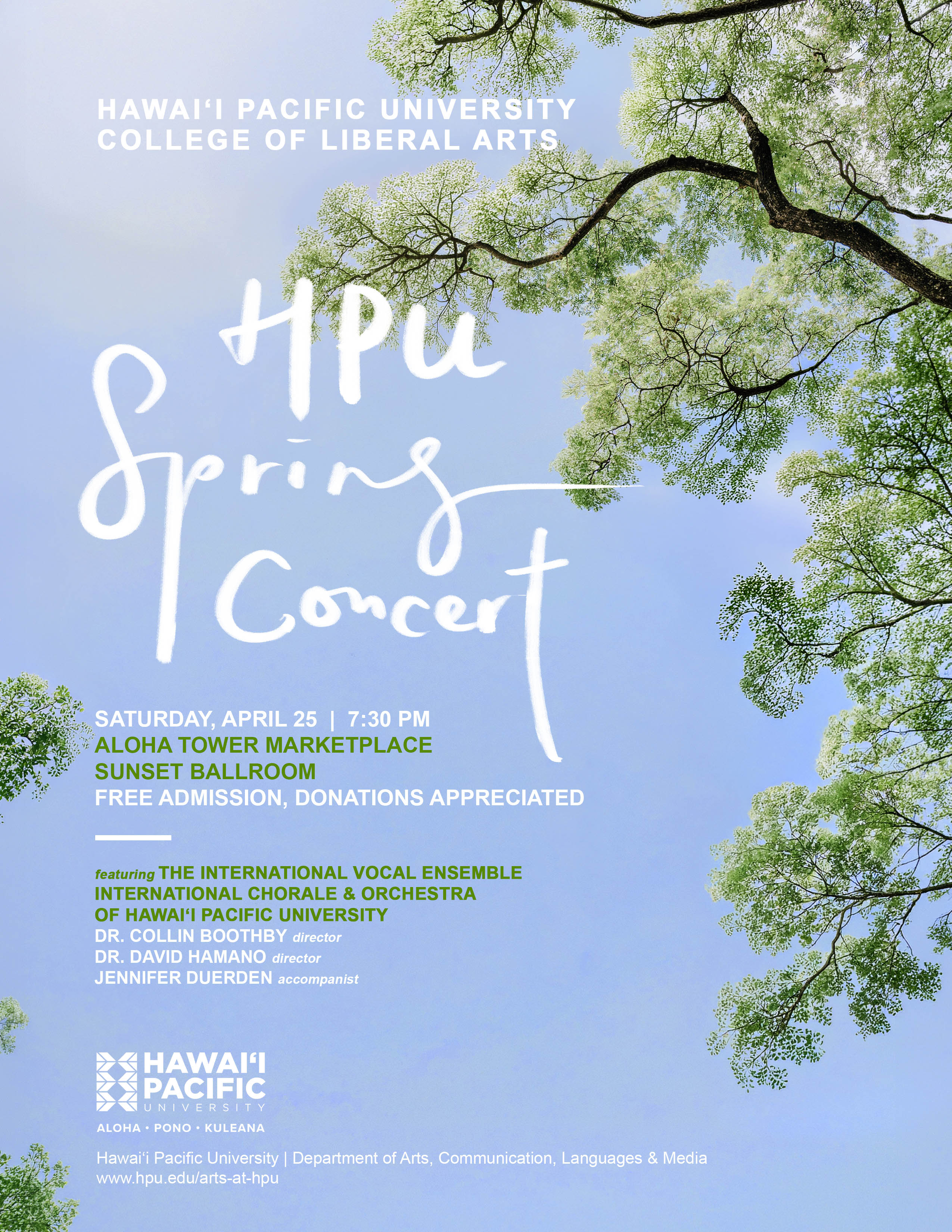 The International Vocal Ensemble, Chorale, and Orchestra from Hawaii Pacific University present their spring concert. For more information, visit https://www.hpu.edu/cla/aclm/arts-at-hpu
