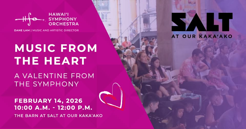 A free Valentine's Day concert featuring the Hawaiʻi Symphony Orchestra at The Barn in SALT at Our Kakaʻako. The event includes live music, a Valentine's Day selfie station, and opportunities for shopping and dining in the area.