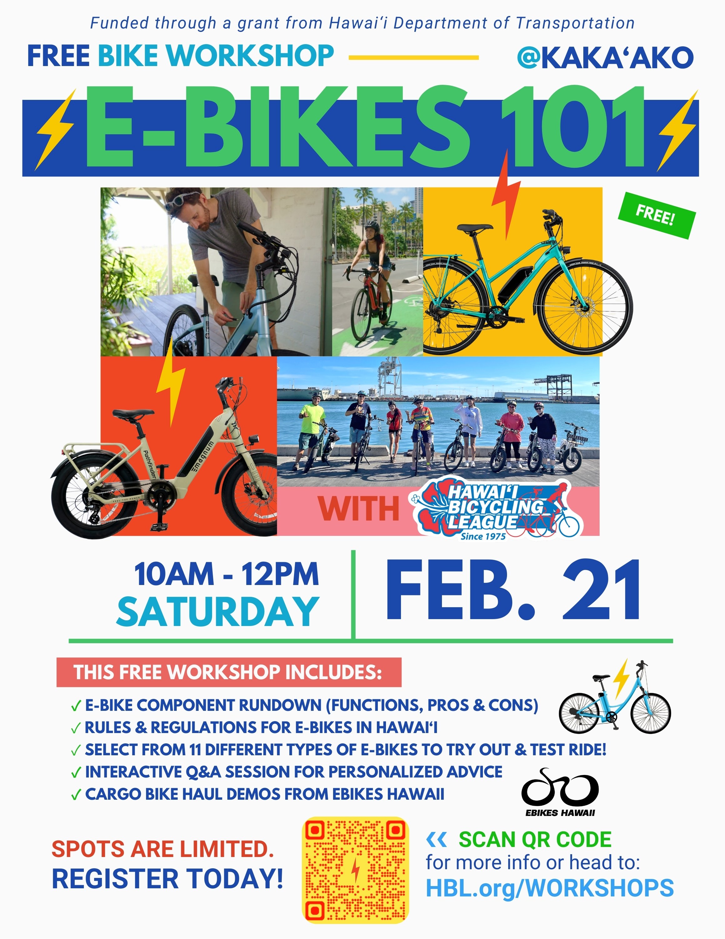 This 2-hour interactive workshop covers essential e-bike topics: Hawaii's e-bike laws, lingo, components, and safety best practices. Includes test rides of various e-bike styles. Limited to first 11 registrants. Put on by Hawaii Bicycling League through a Hawaii DOT grant.