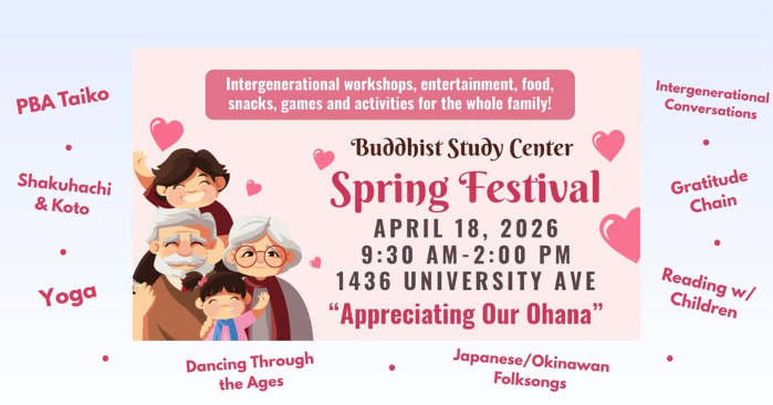 A day of workshops, activities, and entertainment with a focus on family connection and parent-child engagement. The event features intergenerational learning, performances, and community resources! Complete information at https://bschawaii.org/. WORKSHOPS 10:10 a.m. – Gratitude Chain Interactive activity on recognizing connection in our lives with Marcie Moribe 10:50 a.m. – “Body and Brain Yoga” Gentle fitness session with Roy Arakaki \(Body & Brain Fitness Center\) 12:10 p.m. – Read Together Penny Atcheson shares ways parents and children can work together through reading 12:50 p.m. – Intergenerational Conversations Interactive gratitude session with Terry Arakaki ENTERTAINMENT 9:30 a.m. – Taiko with Hyaku Sen Ki Kai \(Pacific Buddhist Academy\) 10:10 a.m. – Dancing Through the Ages 11:30 a.m. – Shakuhachi and koto musicians 1:30 p.m. – Oubaitori \(Japanese and Okinawan folksongs\) with Pacific Buddhist Academy FOOD BOOTHS Jikoen Hongwanji Honpa Hongwanji Hawai‘i Betsuin Oahu District Buddhist Women’s Association COMMUNITY INFORMATION BOOTHS Samaritan Counseling Center American Foundation for Suicide Prevention Hawai‘i Pacific Buddhist Academy Honpa Hongwanji Mission of Hawai‘i Bookstore Project Dana PARKING Available at the UH Mānoa Lower Campus parking structure \(Music Building parking availability will depend on the concert schedule and will be confirmed closer to the event\).
