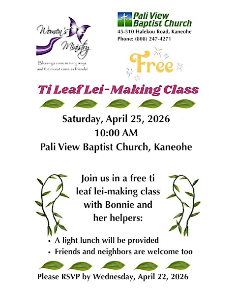 The Women's Ministry FREE ti leaf lei-making class has rescheduled to Saturday April 25, 2026, at 10AM. Sign up to reserve your seat\(s\).