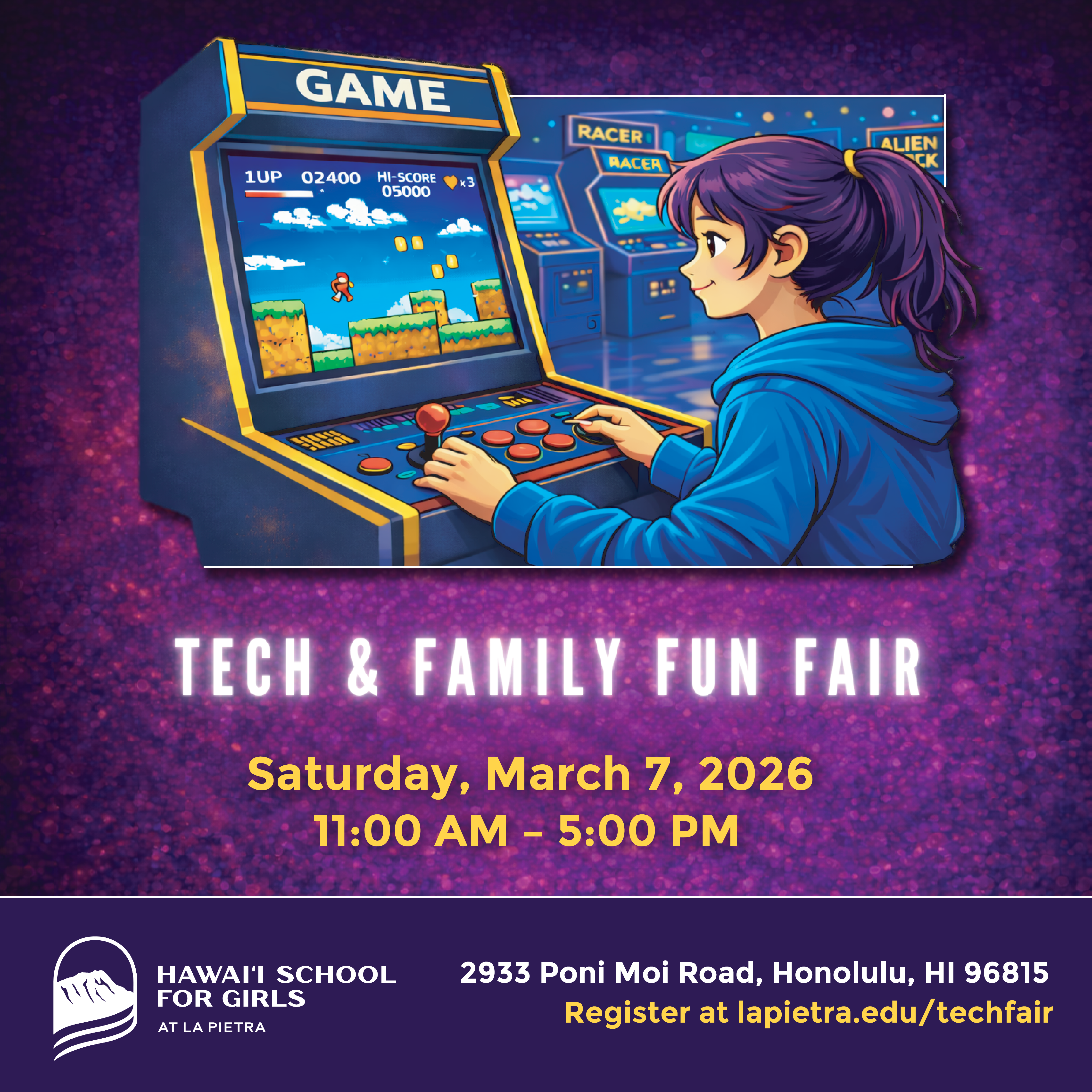 Join us for the third annual Tech & Family Fun Fair on Saturday, March 7, 2026, from 11:00 AM to 5:00 PM at Hawai‘i School for Girls at La Pietra. Admission is free to this family-friendly community event, offering an exciting blend of cutting-edge technology and engaging activities. It’s a day of fun and discovery for attendees of all ages!Immerse yourself in interactive tech experiences, including VR adventures, flight and racing simulators, and Esports play. Families can enjoy pony rides, bounce houses, a petting zoo, and fun games, while browsing local businesses for unique finds and savoring delicious snacks and food truck offerings. Throughout the day, enjoy live entertainment, including magic shows and live music.Free event parking will be available at Jefferson Elementary School, 324 Kapahulu Ave, Honolulu, HI 96815. Shuttle rides will be provided to Hawai‘i School for Girls at La Pietra from 10:45 AM to 5:30 PM.